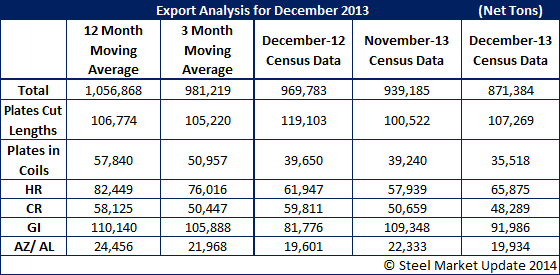 December 2013 U.S. exports for all steel products fell 7.2 percent over November to 871,384 net tons (NT). Compared to December of the previous year when total exports were 969,783 NT, December 2014 exports were down over 10.1 percent. December tonnage was below both the 3 and 12 month moving average (MMA). The primary countries that received steel exports for all products were Canada and Mexico.