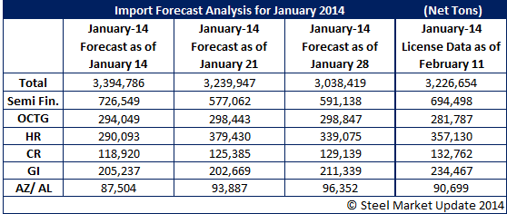 During the month of January, Steel Market Update provided steel import forecasts for the month of January based on the weekly license data provided by the U.S. Department of Commerce. As we have explained previously, license data can be quite misleading compared to the final Census numbers. However, we did receive a number of emails liking the forecasts which included a breakdown of hot rolled, cold rolled, galvanized, Galvalume, slabs and OCTG and our analysis of each product so we are continuing the practice.