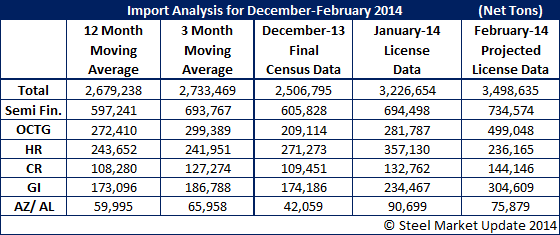The initial forecast for the month of February are based on license data through Tuesday, February 11th. Our initial forecast is calling for total imports to be 3.5 million net tons. Out of the total slabs are forecast to be 734,574 net tons, OCTG 499,048 net tons, Hot Rolled 236,165 net tons, Cold Rolled 144,146 net tons, Galvanized 304,609 net tons and Galvalume 75,879 net tons.