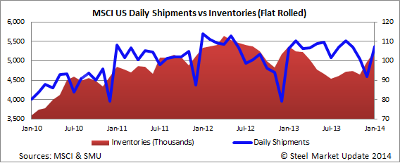 U.S. service centers shipped 107,600 tons per day of carbon flat rolled steels during the month of January 2014. This is better than the 106,200 tons per day shipped during January 2013. Our assumption is shipments could have been slightly higher if not for the weather related closures suffered in many areas of the country. Total tons shipped were 2,368,100 tons up 1.4 percent over last year.