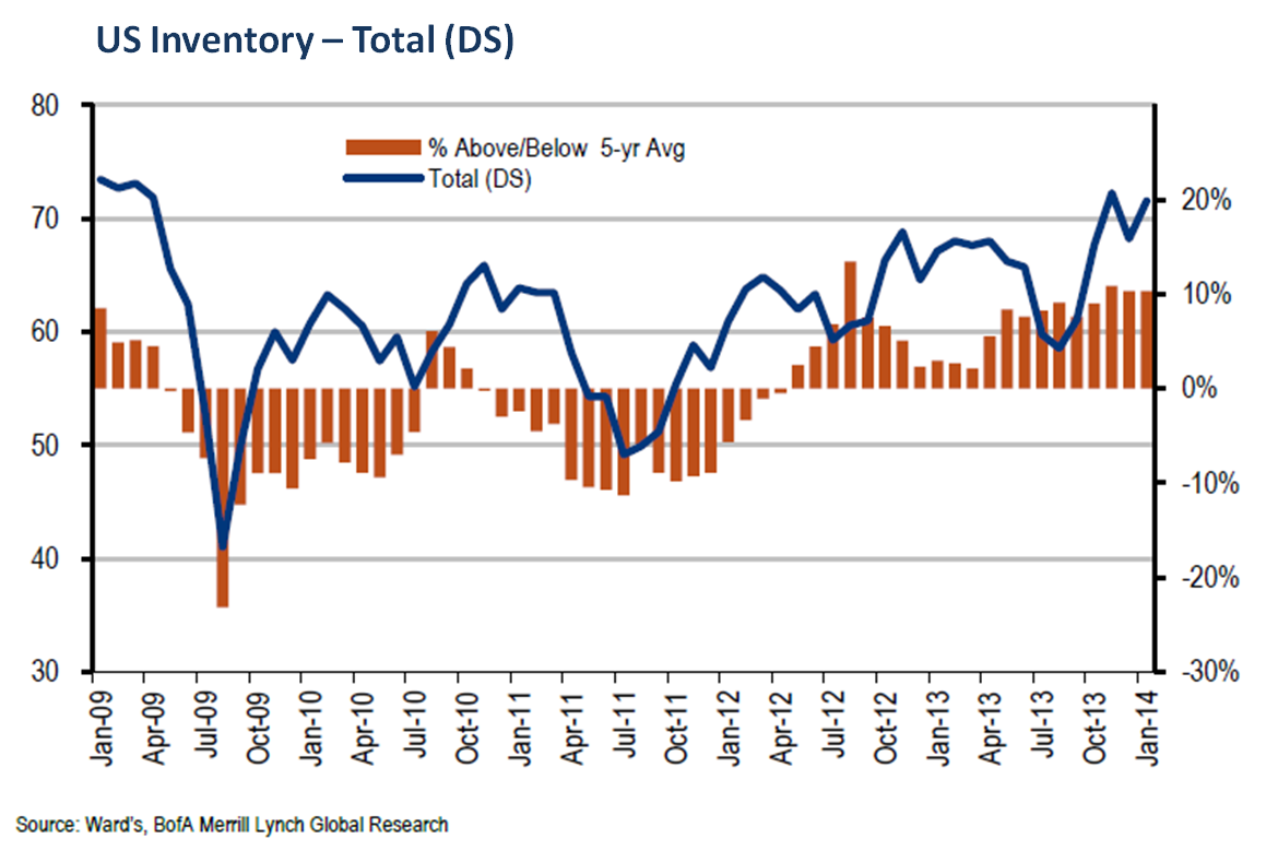 Bank of America Merrill Lynch looked at the figures from a different perspective. “While the current inventory appears relatively high on a trailing 12-month sales basis, when compared to our forward estimate of 16.5mm units for 2014, the current inventory of 3.6mm units equates to 67 days’ supply, just 4% above the 5-year average.”