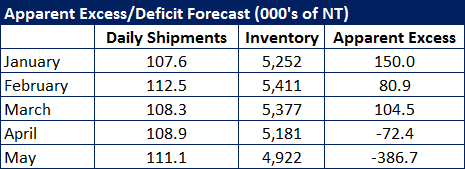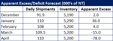 We anticipate shipment levels to improve slightly with only modest growth in inventories during the month of February. Our forecast is for the Apparent Excess to continue but at a slightly lower level (+80,900 tons).