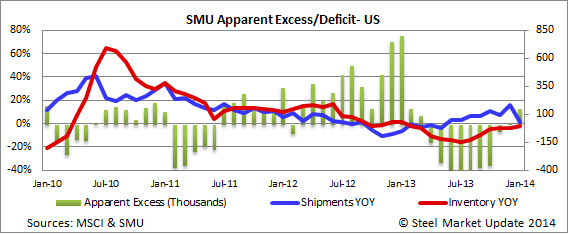 Based on the most recent MSCI flat rolled steel data Steel Market Update has calculated that U.S. service centers grew their “Excess” inventories from +2,000 tons at the end of December to +150,000 ton at the end of January. The “Apparent Excess” is based on a proprietary model which projects future shipments and inventory levels at the domestic distributors.