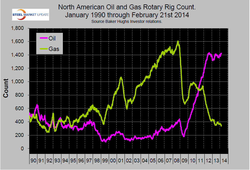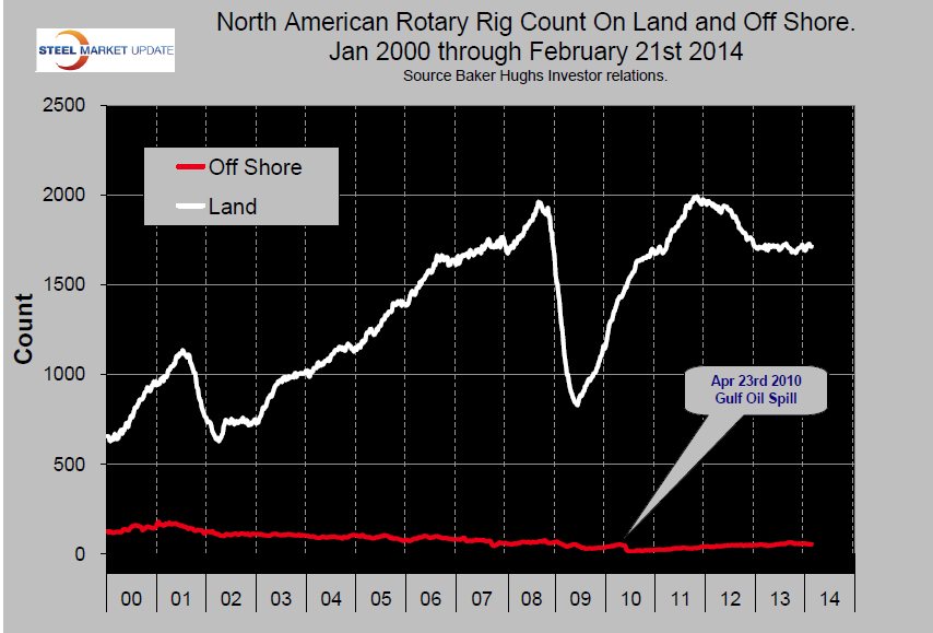 On a regional basis the big three states for operating rigs are now Texas at 843, Oklahoma at 181 and North Dakota at 166. Off shore drilling has recovered from the BP oil spill in 2010 but is still not back to where it was at the beginning of the last decade.