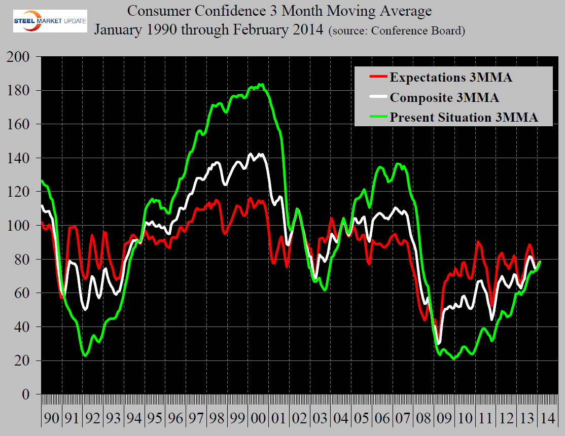 The consumer confidence index declined by 1.3 in February driven by an increase of 4.4 in the present situation component and a decline of 5.4 in consumer expectations. The three month moving average (3MMA) of both the present view and expectations increased which caused the composite to rise from 76.3 to 78.3 (Figure 1).