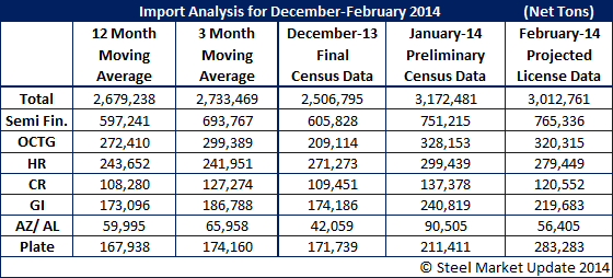 The table below shows total imports and imports by product for December through February along with the 3MMA and 12MMA.