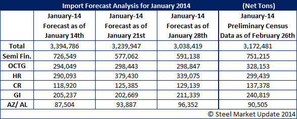 Hot rolled imports in January were reported to be 299,439 NT, up 10.4 percent over December figures and well above the 3MMA and 12MMA.