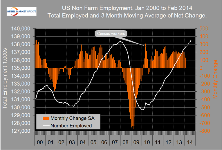 The Bureau of Labor Statistics (BLS) report on non-farm employment beat the consensus expectation of a 150,000 gain in February by showing a net gain of 175,000 jobs. The three month moving average (3MMA) of the net gain has slowed for three consecutive months but the growth trajectory is still on track for a full recovery by the middle of this year (Figure 1).