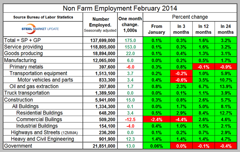 A total of 153,000 jobs were created in service industries and 22,000 in goods producing. The January result for the goods producing sector was revised down by 15,000 all of which was in manufacturing. Of the net new goods producing jobs gained in February, 6,000 were in manufacturing and 15,000 in construction (Table 1). The private sector created 162,000 jobs and government added 13,000 in February.