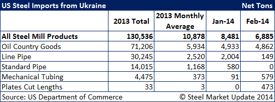 The Ukraine, once part of the Soviet Union, is also a steel supplier to the United States but nowhere near the size and scope of Russia. The Ukraine exported 130,536 tons (all products) to the U.S. during 2013. Based on the first two months of imports the Ukraine is projected to actually ship fewer tons here than last year (92,196 tons). As you can see by the table below pipe and tube are the products preferred by Ukraine suppliers.