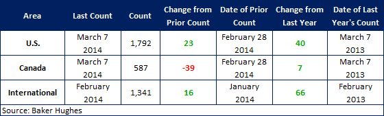 According to Baker Hughes data from March 7th, 2014, the U.S rig count for this week is 1,792 rigs exploring for or developing oil or natural gas. This count is an increase of 23 rigs when compared to last week, with oil rigs up 13 to 1,443 rigs, gas rigs up 10 to 345 rigs, and miscellaneous rigs unchanged at 4 rigs. Compared to last year the 1,792 count is an increase of 40 rigs, with oil rigs up by 102, gas rigs down by 62, and miscellaneous rigs unchanged.