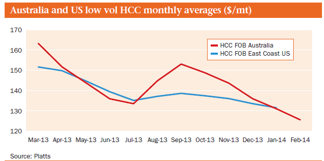 “Everyone is pointing to potential reasons for the weaker prices, but it most likely comes down to supply-demand fundamentals,” said Platts in the latest issue of Steel Raw Materials Monthly. “The market for hard coking coal is oversupplied and demand is lackluster due to weak steel prices and production in China.”
