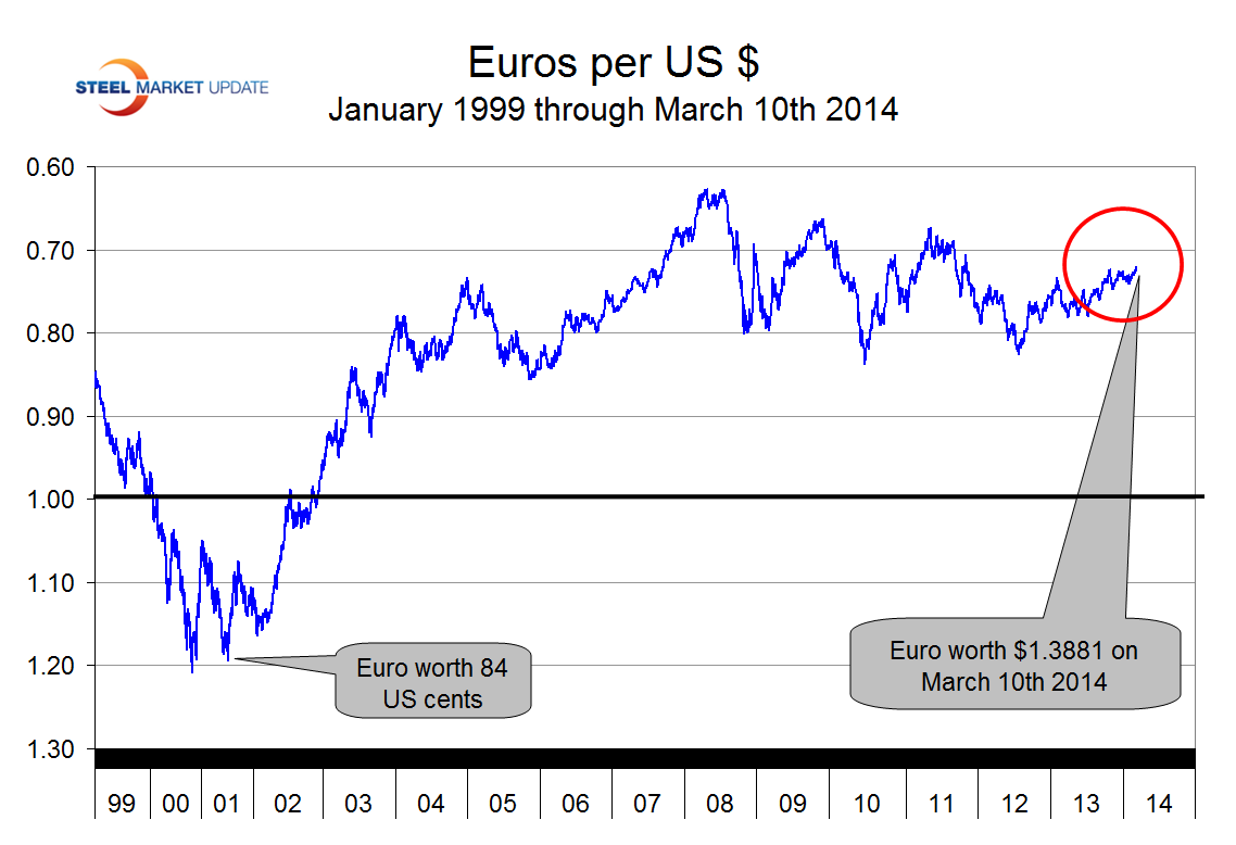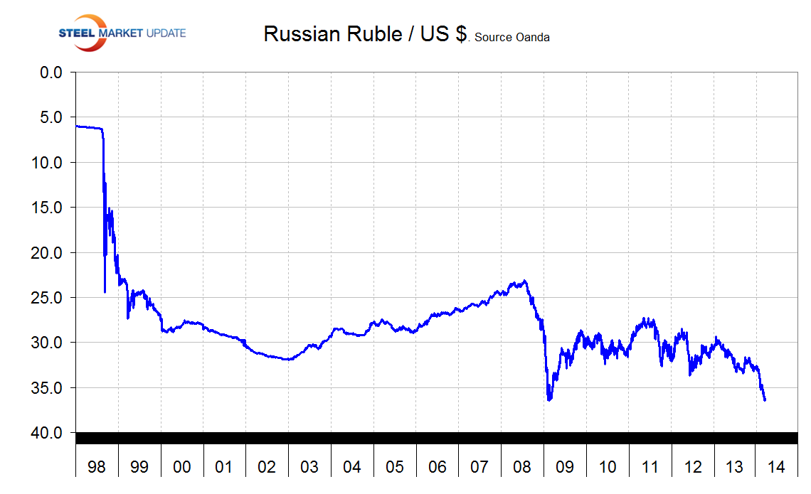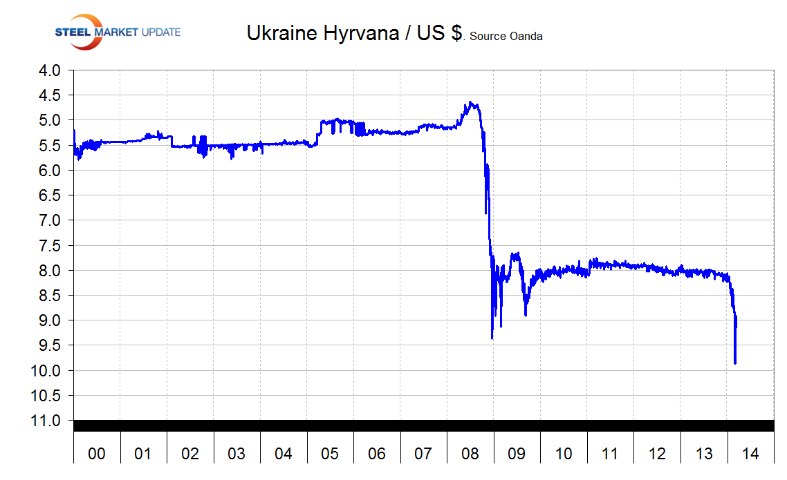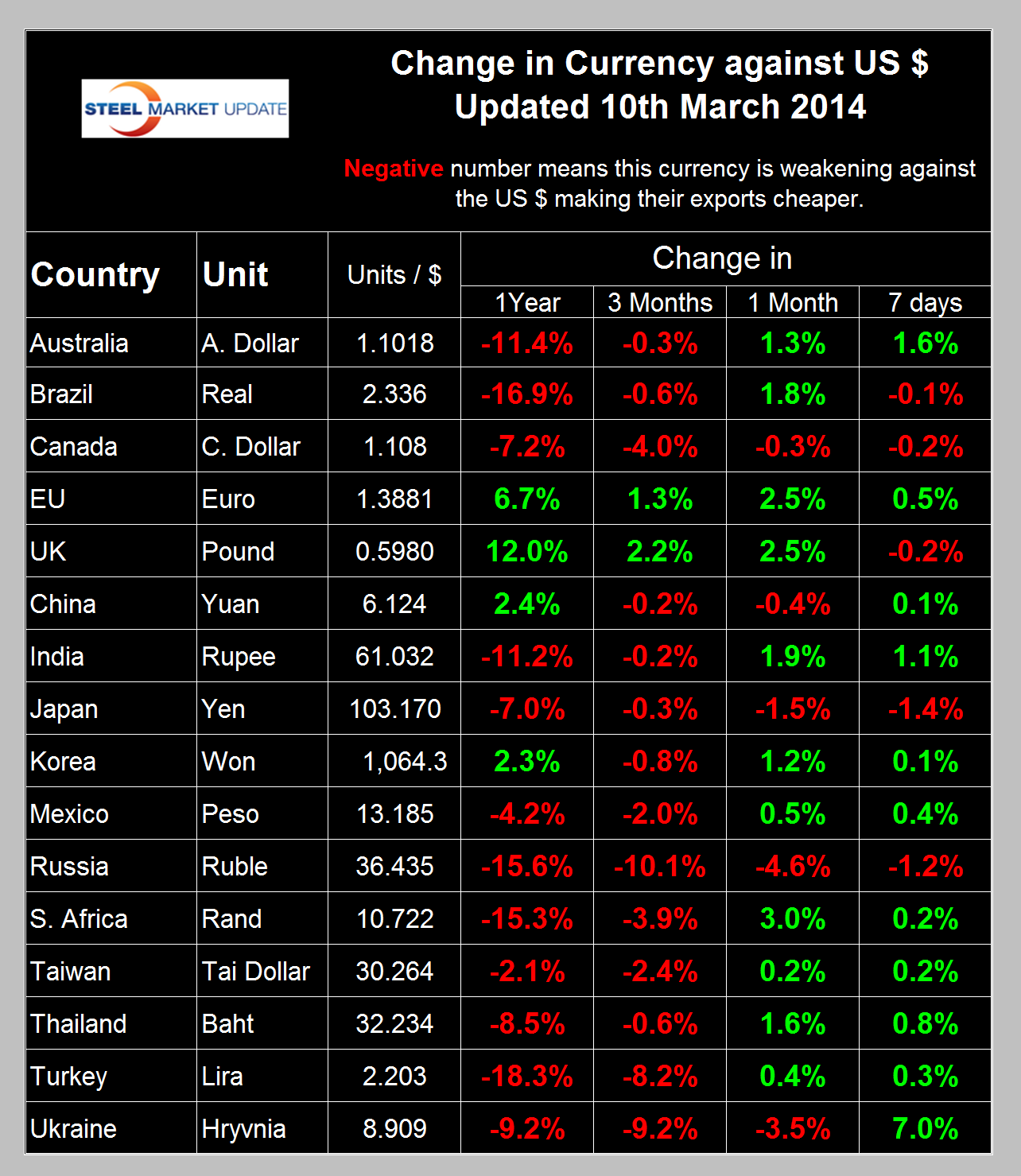 In the last three months the US dollar has strengthened against fourteen of the currencies of the major sixteen steel trading nations. In the last one month, that trend has reversed and eleven of the steel trading currencies have strengthened against the US dollar. Table 1 shows the number of currency units that it takes to buy one US $ and the percent change in the last year, three months, one month and seven days. In the last year, the currencies of the major iron ore producing nations, Australia, Brazil and Canada have weakened against the US$ by 11.4 percent, 16.9 percent and 7.2 percent respectively. A decline in these currencies has a downward influence on the price of iron ore.