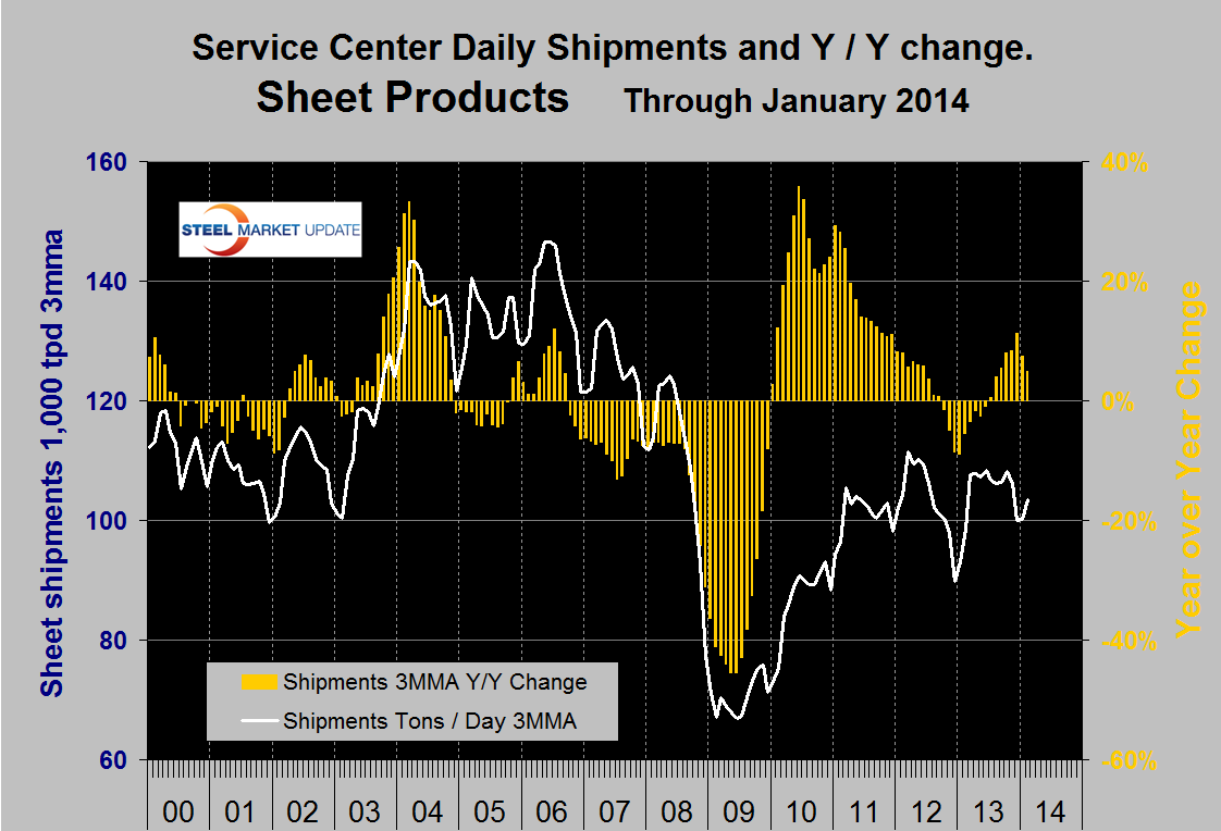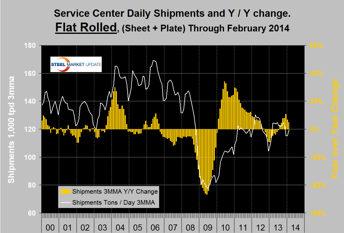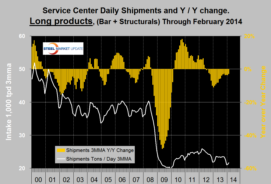 Compared to the end of February last year inventories were up by 0.4 percent in total, only bar and tubulars experienced a decrease. Sheet product inventories were up by 1.4 percent.There is a wide difference between the performance of flat rolled (sheet + plate) and long products (structural + bar) at the service center level. Long products had a very poor recovery from the recession and on a y / y basis have been declining once again for every one of the last 20 months (Figure 1).
