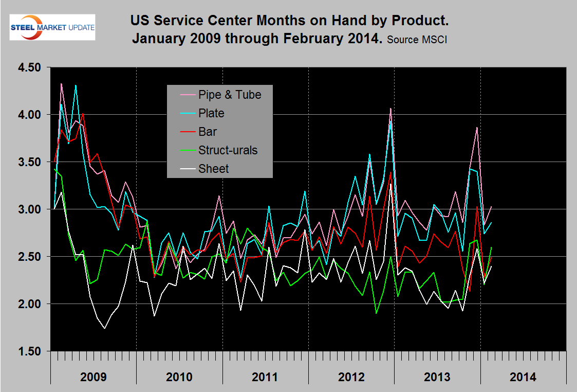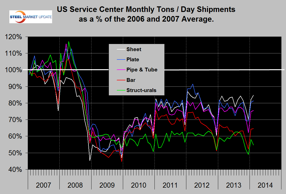Flat rolled has had a much better recovery since mid-2009 and has had positive y / y growth in each of the last seven months (Figure 2). In 2006 and 2007, the good old days, the mills and service centers were operating at maximum capacity. Figure 3 takes the shipments by product since that time frame and indexes them to the average for 2006 and 2007 in order to measure the extent to which each product’s shipments from service centers has recovered. Again it can be seen that sheet and plate have fared best, bar and structurals the worst and tubulars in between. Sheet has had the best recovery and in February was at 84.8 percent of the 2006 /2007 average. Structurals are still only at 54.6 percent of where they were. The total of all carbon products is still only at 76.1 percent of the 2006 / 2007 average therefore is down by 23.9 percent. The recovery of the service center sector has been much slower than has been experienced by the mills. Based on product shipment data from AISI the average monthly carbon steel shipments from the mills in 2006 and 2007 was 8,612,596 tons. In Q4 2013 the average monthly mill shipments was 7,553,668 tons, a decline of 12.3 percent from 2006 /2007. Therefore it appears that service centers shipments are off by almost exactly twice the deficit being experienced by the mills. Presumably this is because in a relatively lack luster market, more buyers are by-passing service centers and buying mill direct and this is probably particularly true of long products. In addition long products being more construction oriented are suffering from prevailing conditions in that business sector.