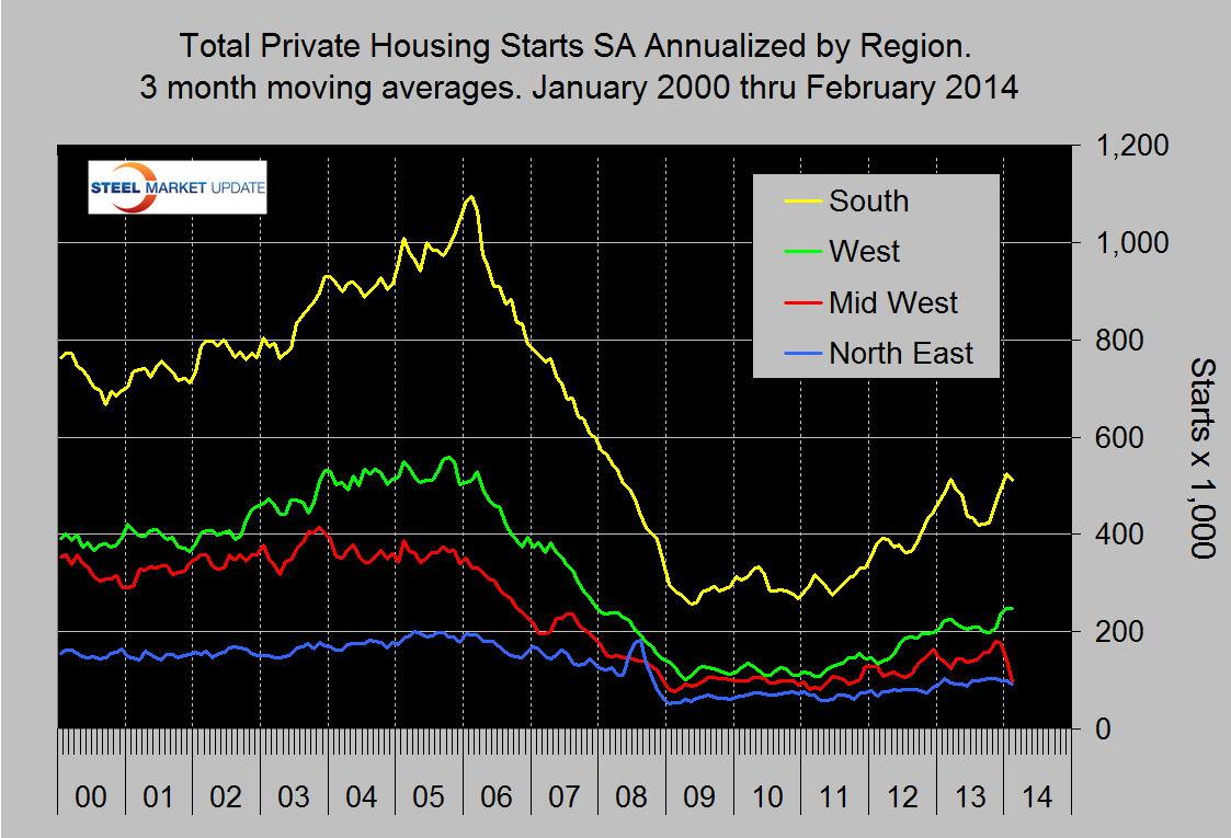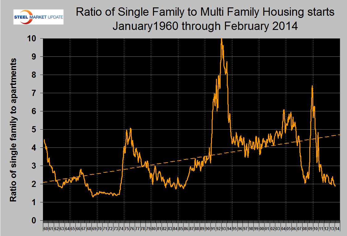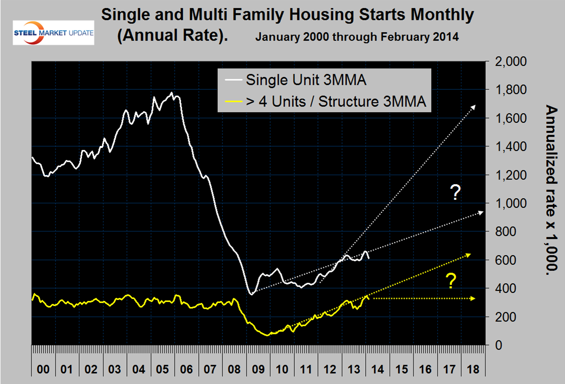 The 3MMA of both single and multifamily starts declined in February. No doubt the inclement weather played a part in this change but taking a long term view it is not clear where housing is headed. If the trend of single family starts regains the trajectory that existed in 2012 then a recovery to the pre-recession peak will occur in 2018 but if the trend is projected back in time to the beginning of the recovery the previous peak will not be regained for a very long time (Figure 2). The trend of multifamily units is also not clear because this sector has already exceeded the pre-recession peak. Since it is clear that the ratio of single to multifamily will not return to its long term trend any time soon, it can be expected that positive growth and steel consumption by this sector will continue for years.