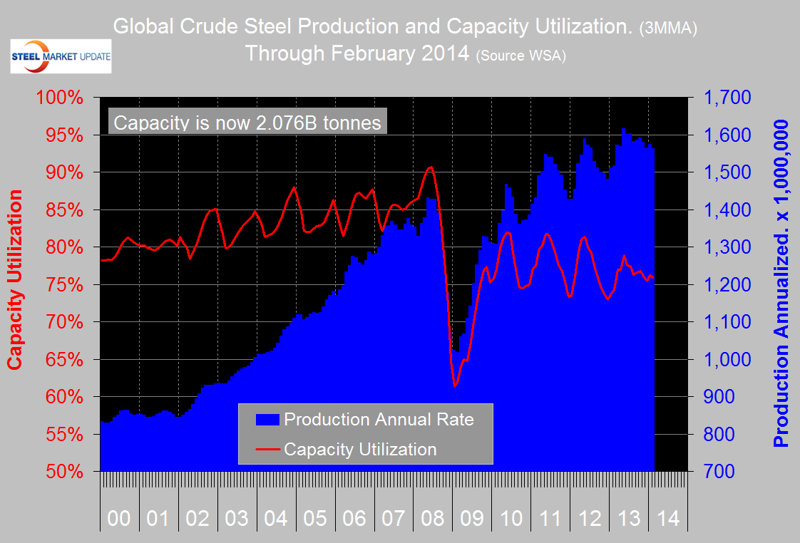 Global Steel Production in February declined by 11.7 million tonnes, normal for that month based on a reduced number of operating days. February steel production was 125 million tonnes, an increase of 0.6 percent from February last year. Capacity utilization on a rolling three month basis through February was 75.9 percent (Figure 1). The annualized three month moving average of production was 1.562 billion tonnes in the December through February time frame. Capacity is now 2.076 billion tonnes.