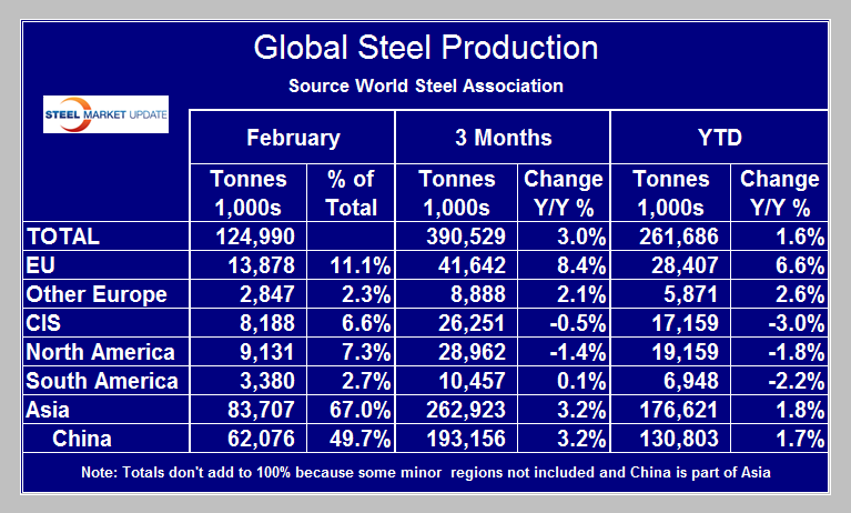 Table 1 shows regional production in February with regional share of the global total, also three months production through February and YTD production. In three months through February y / y growth was 3.0 percent. Year to date through February y / y growth was 1.6 percent. All regions except North America and the CIS had positive y / y growth in three months through February with the European Union continuing to lead the way. South America eked out a small 0.1 percent growth. The growth of China’s steel output has slowed dramatically this year with y / y growth in January and February of 2.9 percent and 0.4 percent, respectively. It is still too soon to tell if China’s production really is being reigned in but the signs are encouraging. North America and China produced 7.3 percent and 49.7 percent of the global total in February respectively.