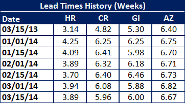 Hot rolled lead times averaged 3.89 weeks down only slightly from 3.94 weeks at the beginning of the month. However, when compared to the same time last year, lead times are slightly longer compared to the 3.14 months posted during mid-March 2013.