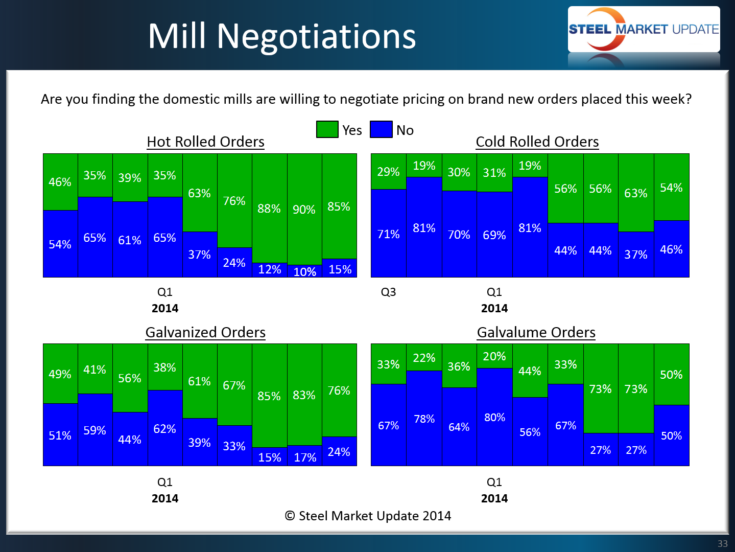 As mentioned in the Lead Times article, SMU began the process of analyzing the flat rolled steel market early on Monday morning – prior to any flat rolled price increase announcements being made. More than likely the survey results regarding mill negotiations represented by the graphic below are going to have about half the respondents reporting their situation prior to the announcements and the rest after the announcement.