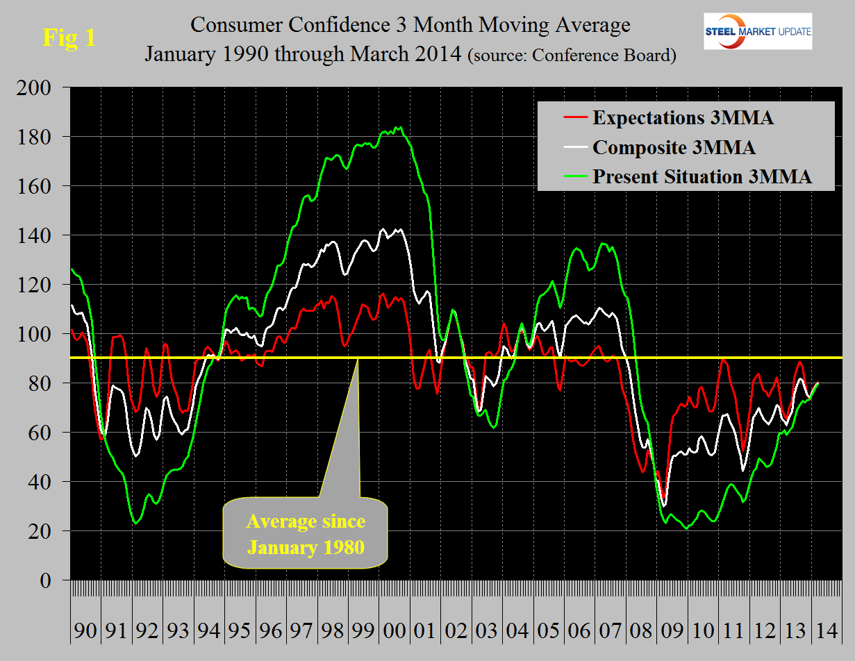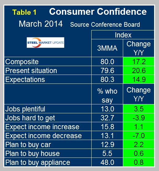 SMU Comment: Consumer confidence drives consumer spending which is the largest component of GDP. Steel consumption is a function of GDP though the steel component is much more volatile than the headline number. The third estimate of GDP growth and subcomponents for Q4 2013 will be released on Thursday this week and will be analyzed and reported in the Steel Market Update. It will be this time next month before we learn how much effect the harsh winter had on growth in Q1 2014. (Sources: The Conference Board and Economy.com)