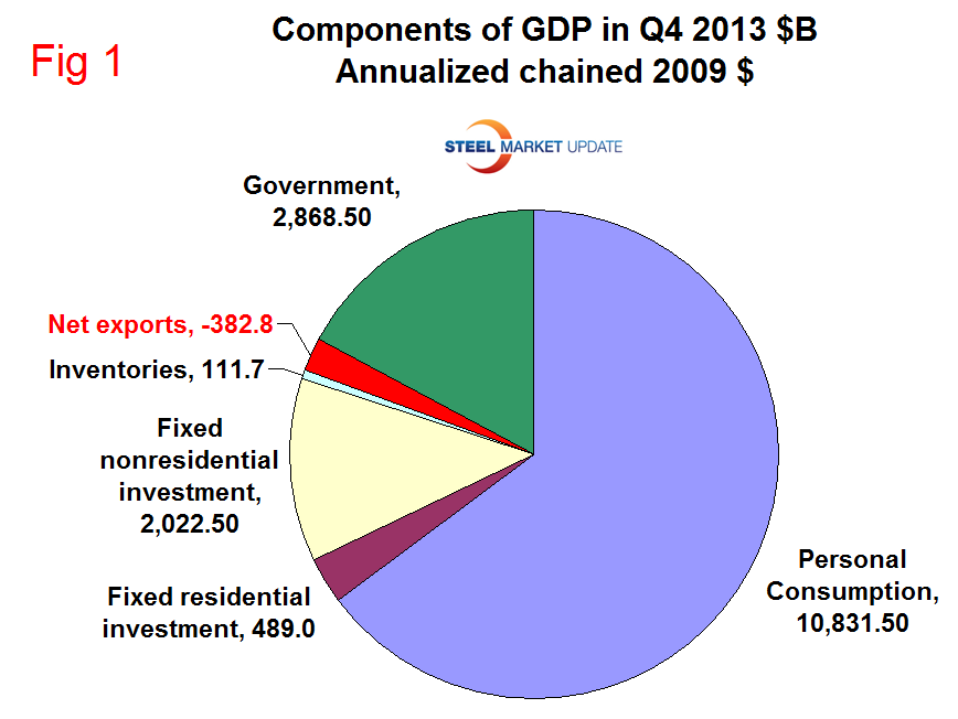 Personal consumption, the largest individual component of GDP rose by 2.22 percent, its best performance since Q4 2010. In Q4 personal consumption accounted for 67.94 percent of GDP (Figure 1). All other components contributed 0.38 percent meaning that they were more or less a wash. On the positive side next exports contributed 0.99 percent and government was the exact opposite with a negative contribution of 0.99 percent. Fixed residential, (housing) investment made a negative contribution of 0.26 percent, its first negative contribution since Q3 2010. Fixed nonresidential contributed 0.68 percent making 3 consecutive quarters of solid growth. Inventories which are the most volatile component of GDP broke even in the fourth quarter.