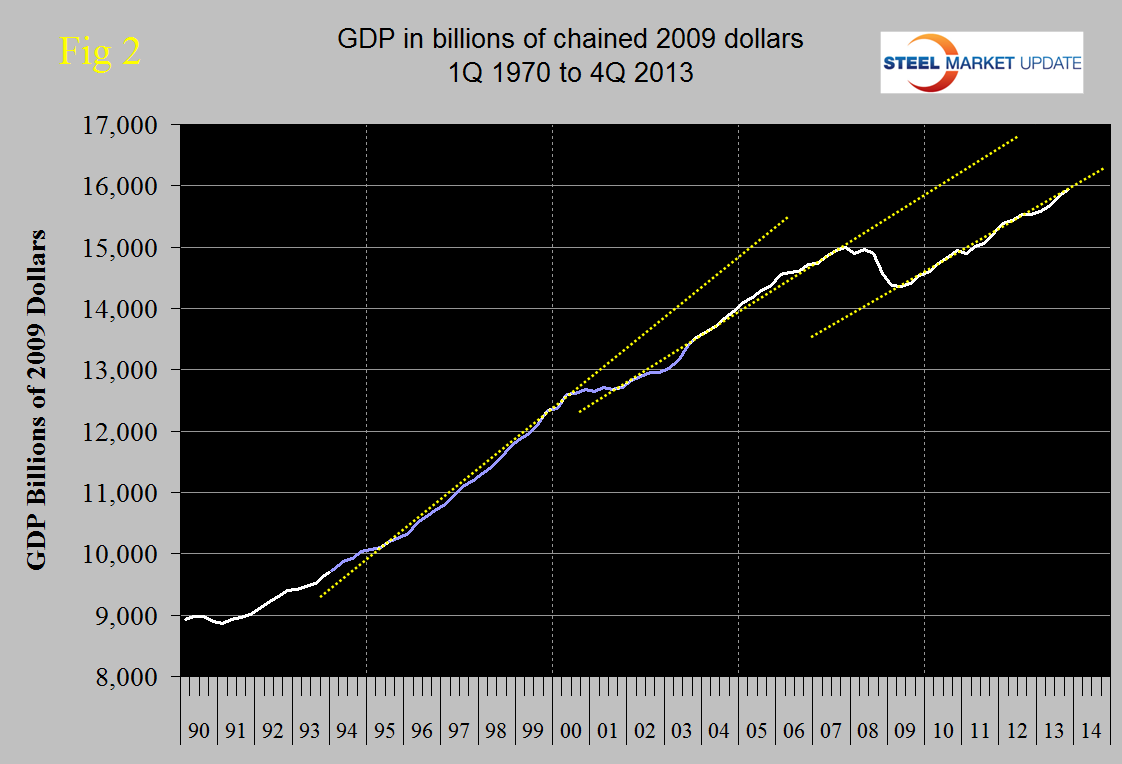 The Bureau of Economic Analysis (BEA) released their third estimate of real GDP today, (March 27th) for Q4 2013. The third is normally the final estimate though there sometimes are revisions further back in time. GDP rose in the fourth quarter by 2.6 percent at a seasonally adjusted annual rate, this was an upward revision from the second estimate of 2.4 percent, but still well below the advance estimate of 3.2 percent. For the year as a whole GDP rose by 2.59 percent to 15.942 trillion dollars (Chained 2009 dollars.)