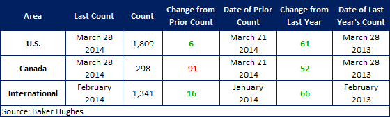 According to Baker Hughes data from March 28th, 2014, the U.S rig count for this week is 1,809 rigs exploring for or developing oil or natural gas. This count is an increase of 6 rigs when compared to last week, with oil rigs up 14 to 1,487 rigs, gas rigs down 8 to 318 rigs, and miscellaneous rigs unchanged at 4 rigs. Compared to last year the 1,809 count is an increase of 61 rigs, with oil rigs up by 133, gas rigs down by 71, and miscellaneous rigs down by 1.