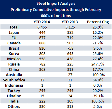 Total steel imports in February 2014 were 3.250 million tons compared to 3.205 million tons in January 2014, a 1.4 percent increase, and a 29.6 percent increase compared to February 2013. For the year- to – date period, imports increased from 5.125 million tons in the first two months of 2013 to 6.455 million tons in the same 2014 period, a 25.9 percent increase. The data show that imported semi-finished products increased by 22.7 percent in February 2014 compared to February 2013, from 622 thousand tons in 2013 to 763 thousand tons in 2014, based on preliminary reporting. For the year-to-date period, imported semi-finished products increased from 1.095 million tons in the first two months of 2013 to 1.527 million tons in the same 2014 period, a 39.5 percent increase.