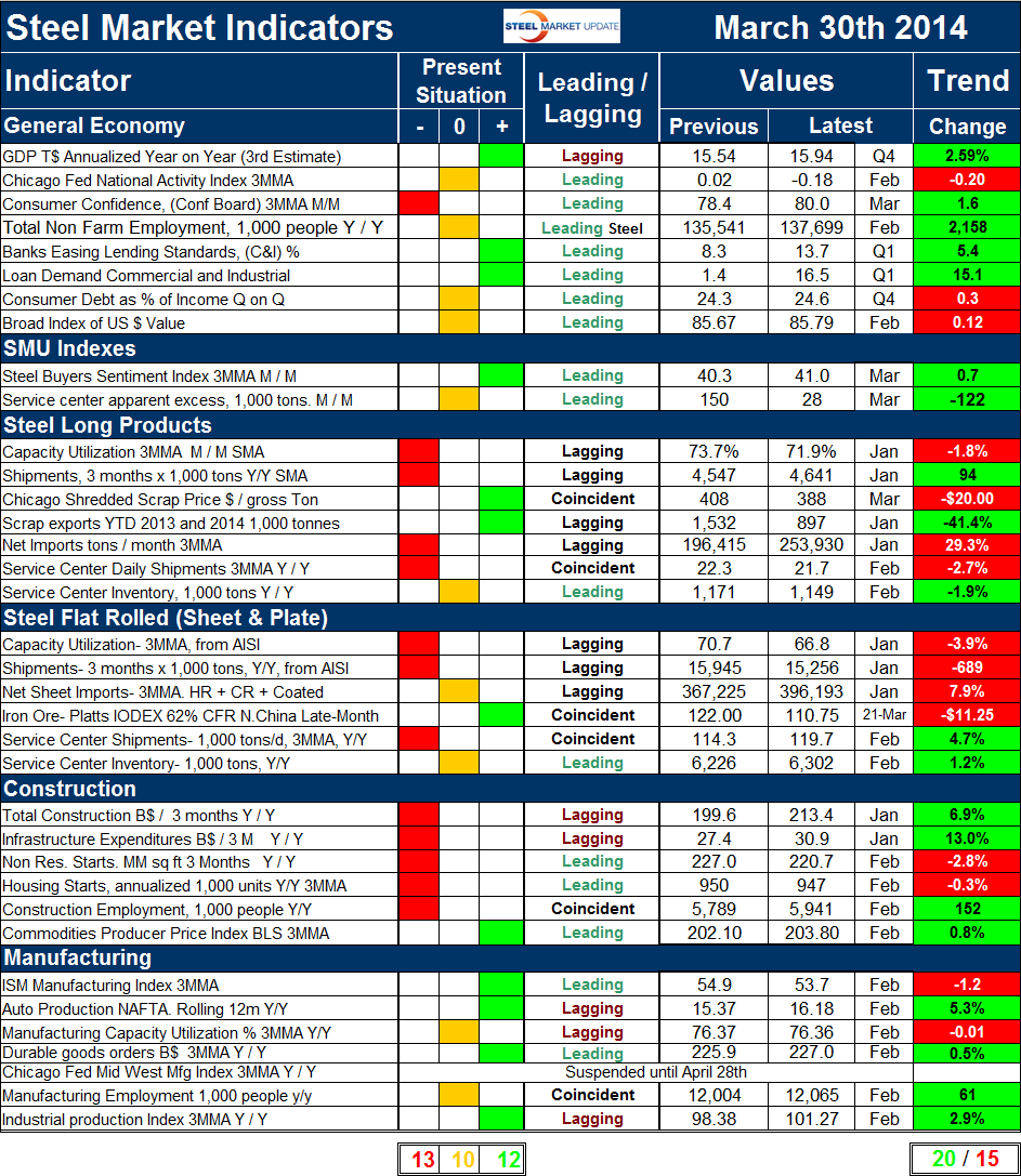 The quantitative analysis of the value of each indicator over time is shown in the “Trend” column. There has been a significant shift in a negative direction since this analysis was last published a month ago when twenty six indicators were trending positive and ten negative. On March 30th, twenty indicators were trending positive and fifteen negative. Trends in the general economy are improving with five of eight indicators heading in the right direction. This is a decrease of one from last month as consumer debt increased. The trend of the SMU steel buyer’s sentiment index continued to be positive and that of the service center surplus changed from negative to positive. In February service centers had a surplus of intake over shipments of 148,000 tons. In March this reversed with a deficit of 122,000 tons. We consider a deficit to be a positive for prices as inventories are not over loaded. In the long product steel sector both mill shipments and net imports reversed course. Shipments measured as 3 months total year over year improved from –50,000 tons in February to +94,000 tons in March. Net imports measured as a 3MMA month/month decreased by 11.4 percent in February but increased by 29.3 percent in March. Other trends maintained their direction for long products, including service center shipments which are trending down year over year. In the flat rolled sector four indicators trended negative in the last month and two positive which was a reversal of the breakdown reported in February. The changes were in mill shipments which on a 3 month basis y/y decreased by 689,000 tons compared to growth on the same basis of 1.036 million tons in February. Net imports increased in March by 7.9 percent on a 3MMA m/m basis.
