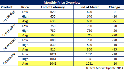 Galvalume also saw a mild decline in their benchmark .0142” AZ50 Grade 80 which dropped $10 per ton from $1041 at the end of February to $1031 at the end of March.