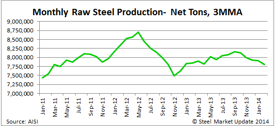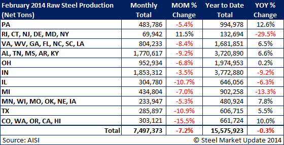 Total raw steel production in 2014 throughout February is now 15,575,923 NT which is 0.3 percent below that of 2013 through the same time period. The capacity utilization rate for the month of February was reported to be 77.9 percent and 76.8 percent for 2014 YTD. (Source: AISI)