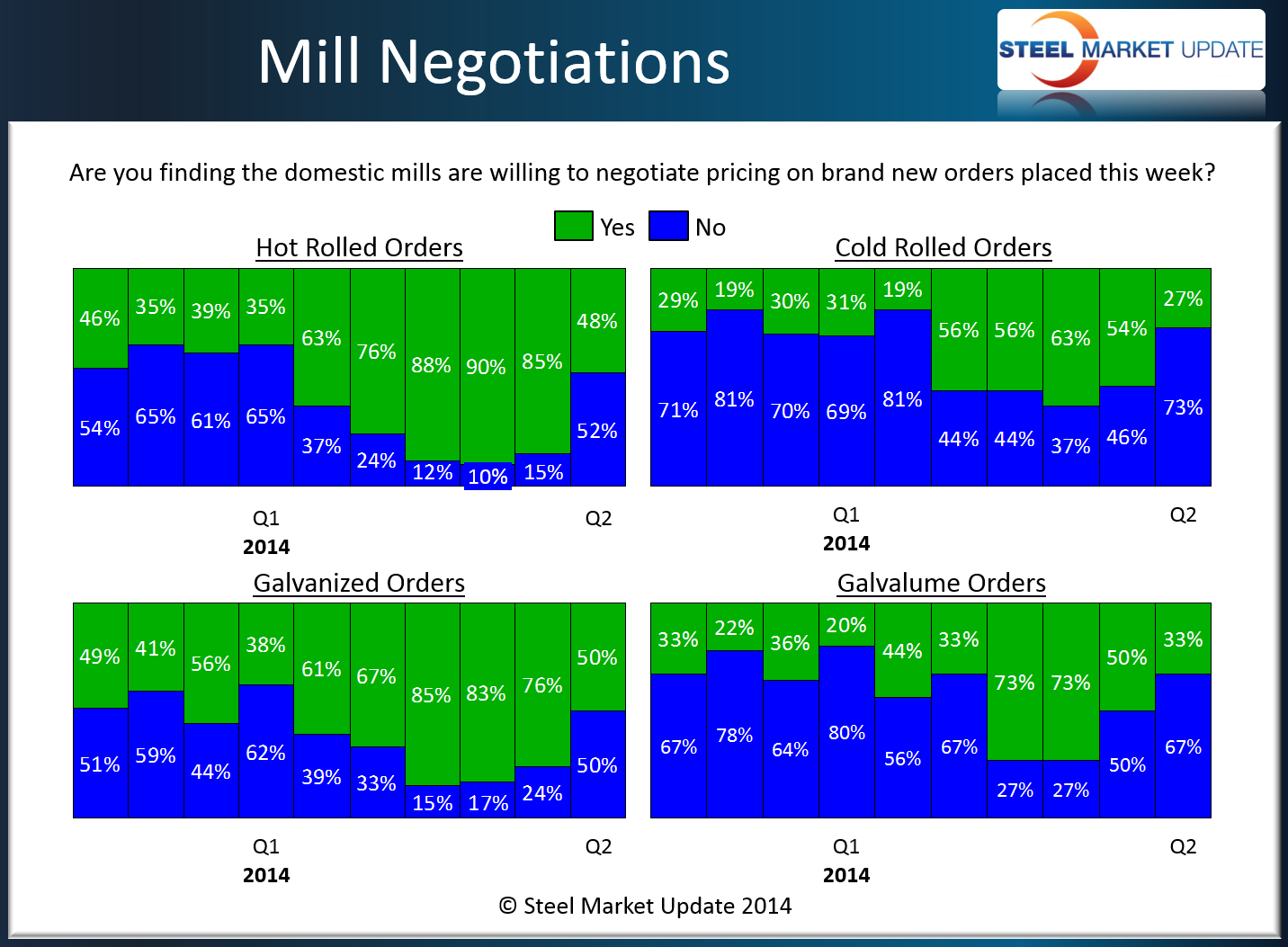 Buyers and sellers of flat rolled steel are reporting the domestic steel mills as much less willing to negotiate prices this week as compared to two weeks ago. Our market analysis saw major contraction in each of the products with hot rolled moving from 85 percent down to 48 percent. Cold rolled halved their previous 54 percent, as this week we measured CR willingness at 27 percent. Galvanized dropped from 76 percent to 50 percent and Galvalume fell from 50 percent to 33 percent.