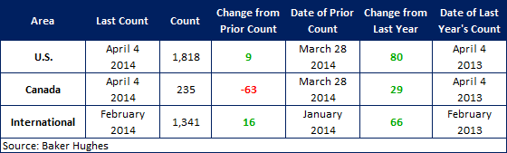 According to Baker Hughes data from April 4th, 2014, the U.S rig count for this week is 1,818 rigs exploring for or developing oil or natural gas. This count is an increase of 9 rigs when compared to last week, with oil rigs up 11 to 1,498 rigs, gas rigs down 2 to 316 rigs, and miscellaneous rigs unchanged at 4 rigs. Compared to last year the 1,818 count is an increase of 80 rigs, with oil rigs up by 141, gas rigs down by 59, and miscellaneous rigs down by 2.