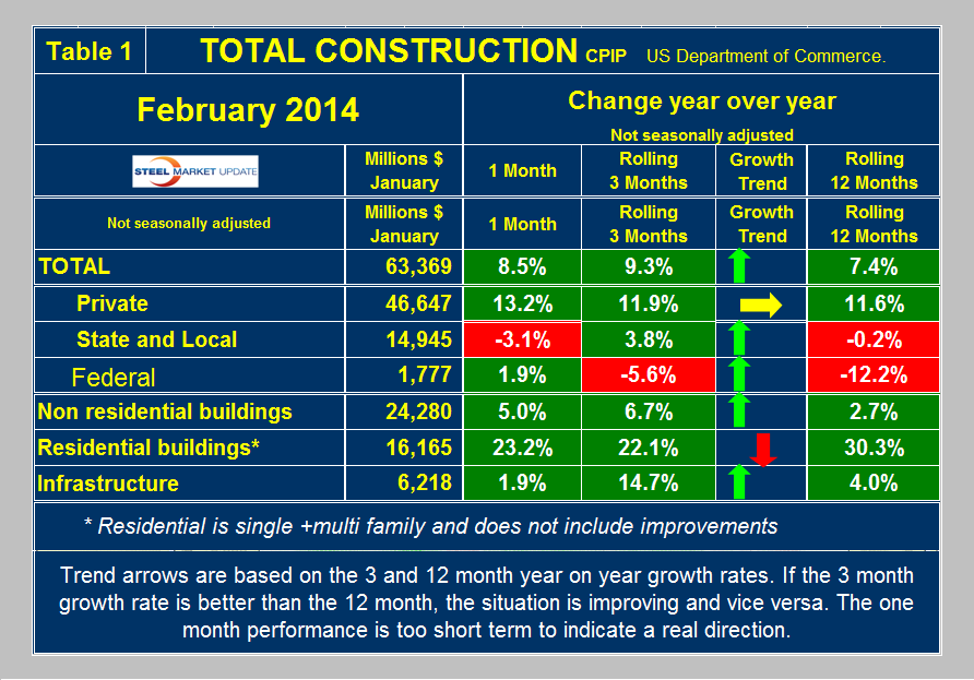 Total Construction: February expenditures were $63.369 billion which breaks down to $46.647 B of private work, $14.945 B state and locally financed and $1.777 B of federal expenditures (Table 1). Federal expenditures are declining rapidly as Washington struggles with its deficit but this construction sector is so small as to be of little interest. On a rolling three month basis total construction was up by 9.3 percent year over year (y/y) and was up by 7.4 percent on a rolling 12 months y/y. This means that total construction growth has positive momentum since the short term growth (3 months) was greater than the long term (12 months). The momentum of private construction was only 0.3 percent which we consider to be basically flat, however, state and local (S&L) work had positive momentum of 4.0 percent and positive growth of 3.8 percent in the three months through February. We consider three sectors within total construction. These are non residential, residential and infrastructure. On a rolling three month basis y/y non residential is growing at 6.7 percent and accelerating. Residential is growing at 22.1 percent and slowing. Infrastructure grew 14.7 percent y/y in the last three months showing rapid acceleration. All numbers quoted in this analysis are not seasonally adjusted. Construction is highly seasonal and for our purposes we always compare data year over year to eliminate this effect. The growth of total construction has been fairly steady for over 18 months averaging about 7.0 percent but it will be 2018 before the pre-recessionary peak is regained (Figure 1).