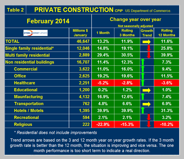 Private Construction: Private work accelerated slightly from an 11.6 percent growth rate in 12 months y/y to an 11.9 percent rate in 3 months y/y (Table 2). The single month of February 2014 was 13.2 percent stronger than February last year, which seems to fly in the face of other data that was adversely affected by severe weather. According to the Association of General Contractors analysis, this may be because of the models that the Commerce Department uses to supplement actual numbers. In which case there will be a payback in future months. The growth of private work has been in double digits for most of the last 24 months but at the current rate it will be mid 2017 before recovery is complete (Figure 2). Table 2 breaks down the private sector into project types. Residential buildings, both single and multi-family, are growing rapidly though slowing. This data coincides well with the housing starts data that SMU reports every month and supports the view that residential building continues to favor multifamily structures. Private non residential buildings are growing at a 12.3 percent rate and accelerating. Within private non residential, only health care and religious buildings are showing a sustained contraction. On the other hand, hotels/motels are showing surprising strength and accelerating. Offices, commercial and manufacturing all have double digit growth rates.