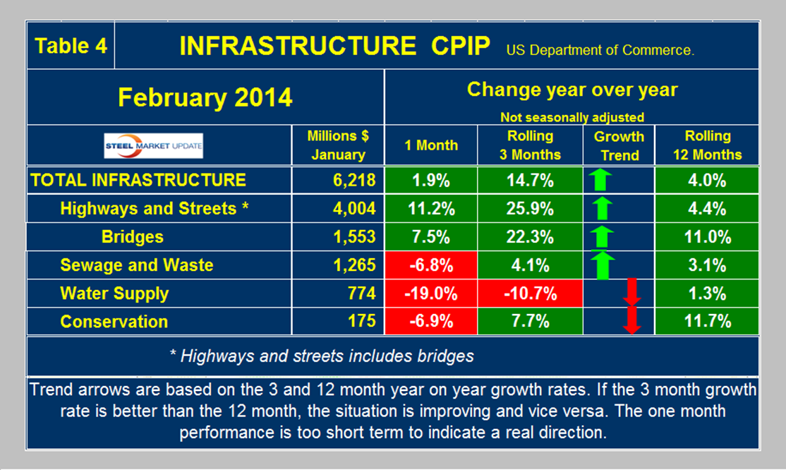Infrastructure: Total infrastructure expenditures accelerated from a 4.0 percent growth rate in 12 months through February to 14.7 percent in 3 three months through February (Table 4). Highway and streets construction, which includes bridges, grew at a 25.9 percent rate in the three months through February y/y. The only sectors that slowed in three months through February were sewage and waste and conservation. Based on the Commerce Department CPIP reports, the state of infrastructure expenditures is not as bad as the press would have us believe. At the present rate of growth, infrastructure expenditures will reach the pre-recessionary level before the end of 2014 (Figure 4). This is far from the case with residential and non residential construction. New transportation funding proposals are alive in Congress but gridlock is preventing agreement on how to proceed.