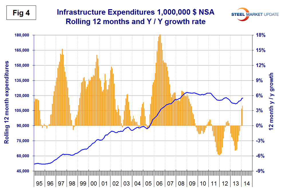 Infrastructure: Total infrastructure expenditures accelerated from a 4.0 percent growth rate in 12 months through February to 14.7 percent in 3 three months through February (Table 4). Highway and streets construction, which includes bridges, grew at a 25.9 percent rate in the three months through February y/y. The only sectors that slowed in three months through February were sewage and waste and conservation. Based on the Commerce Department CPIP reports, the state of infrastructure expenditures is not as bad as the press would have us believe. At the present rate of growth, infrastructure expenditures will reach the pre-recessionary level before the end of 2014 (Figure 4). This is far from the case with residential and non residential construction. New transportation funding proposals are alive in Congress but gridlock is preventing agreement on how to proceed.