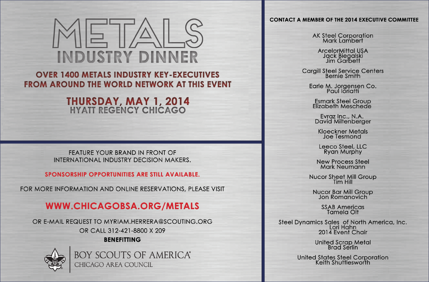 Every year the metals industry in the Chicago area produces a fund-raiser for the Boy Scouts of America. As the years have gone by, the dinner has become one of the premium networking opportunities for those associated in the steel and non-ferrous metals industries. We have heard this year’s event, which will be held at the Hyatt Regency Hotel in downtown Chicago on May 1st, is promising to be one of the largest in years.
