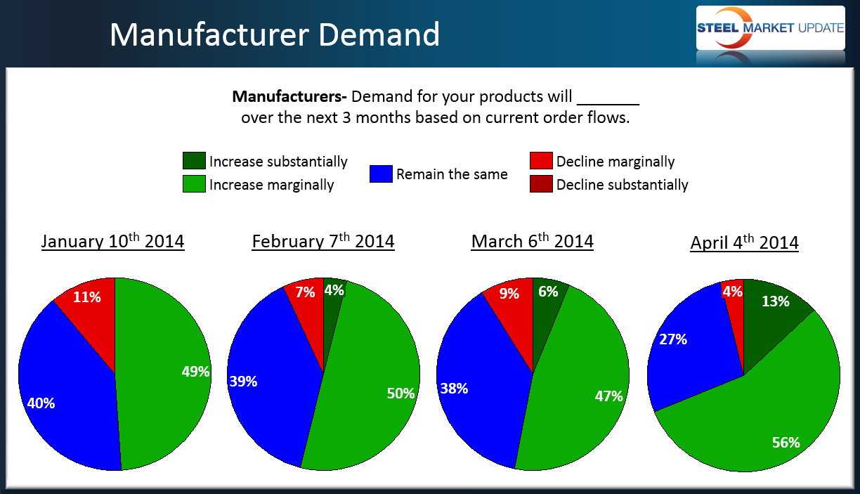We also asked the service centers to weigh in on releases from their customer base to see if they are also seeing rising demand at the end users. What we saw in the results from last week’s market analysis was an improvement in the percentage of service centers reporting their customers as releasing more steel (35 percent vs. 24 percent one and two months earlier) and a reduction in those reporting their customers were releasing less steel (17 percent vs. 22 percent the prior month).