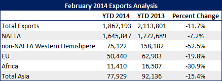 The American Institute for International Steel reported “February 2014 showed mixed to disappointing results for U.S. steel exports.” The following report is from an AIIS press release regarding exports of steel out of the domestic (US) mills during the month of February. Key to the data is NAFTA exports which, according to the AIIS, represent three-quarters of total steel exports out of the U.S. Here is the AIIS report: