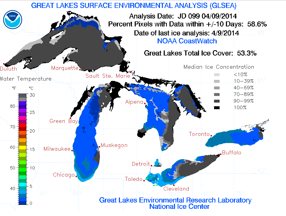 Ice conditions for the Great Lakes are still pretty severe, particularly for Lake Superior with 83.2 percent of the surface still frozen according to analysis reports from the Great Lakes Environmental Research Laboratory. Total ice coverage on the Lakes as of April 9 is 58.6 percent. With shipping season officially underway in the St. Mary’s River, it will be about two weeks until iron ore freighters can cross Lake Superior-Huron without the assistance of icebreakers, according to Mark Gill, director of vessel traffic service for the U.S. Coast Guard in Sault Ste. Marie.