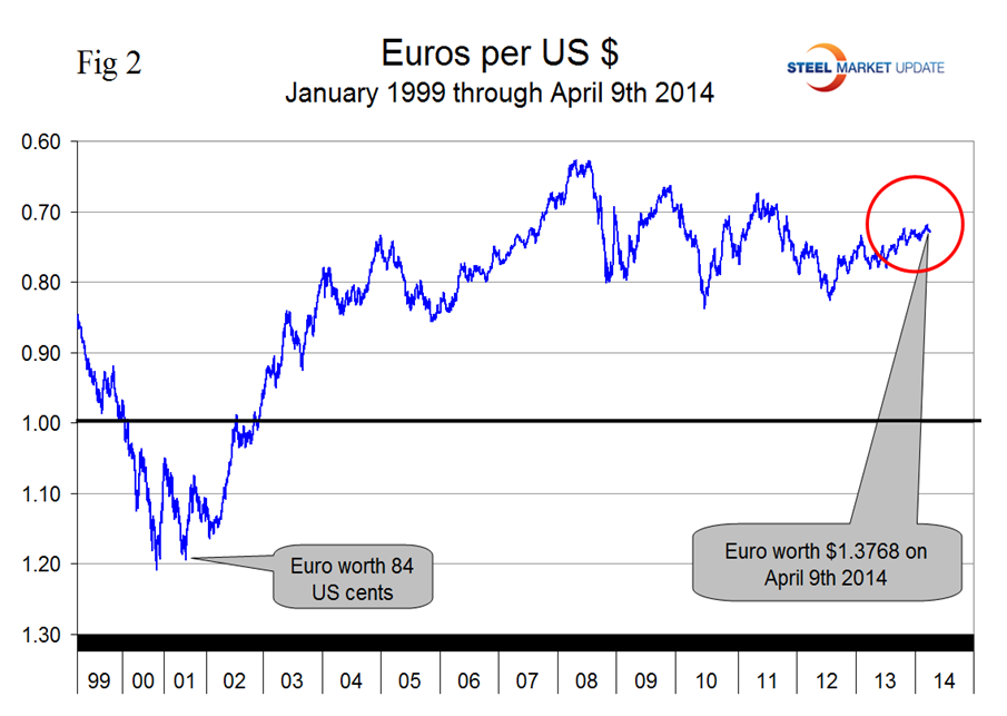 The Euro stood at 1.3768 US Dollars on April 9th (Figure 2) has strengthened steadily for over 18 months and is up by 5.9 percent in the last year.