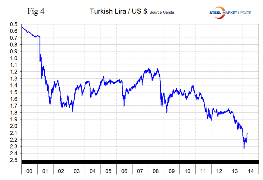 The Turkish Lira has recovered from its all-time low of 2.3299 / US Dollar on January 26th to 2.1011 on April 9th (Figure 4).