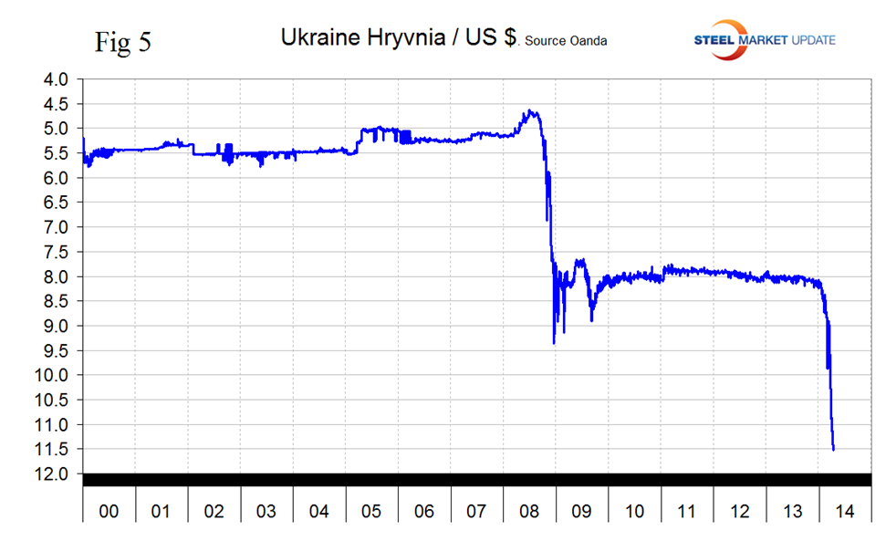 The Ukrainian Hryvnia is continuing its free fall, down by 22.7 percent in the last month and 3.2 percent in the last seven days (Figure 5).