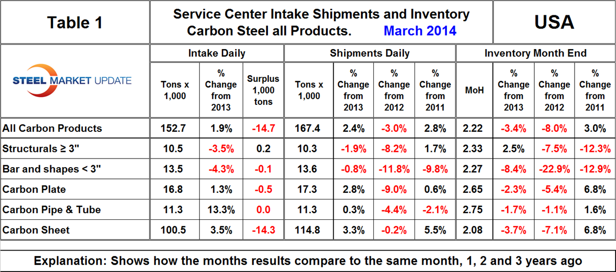 Table 1 shows the performance by product in March compared to the same month in previous years. Shipments of all products on a t/d basis were up by 2.4 percent from March last year but this performance did not extend to long products. Both bar and structural t/d shipments were down from last year. Sheet products were up by 3.3 percent and plate by 2.8 percent. Pipe and tube about broke even with a y/y increase of 0.3 percent. The t/d shipments of all products were down from March 2011. In March intake followed the same pattern as shipments which is not always the case. Only structurals had an intake surplus in March. Compared to the end of March, last year inventories were down by 3.4 percent in total, only structurals experienced an increase. Except for structurals in 2014, inventories have been down across the board for two years.