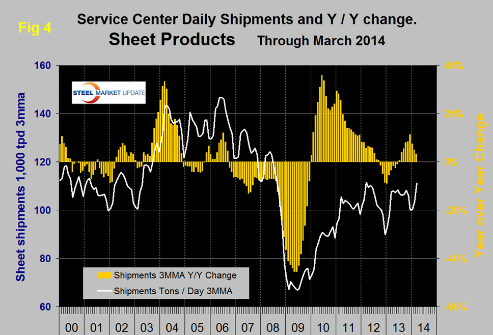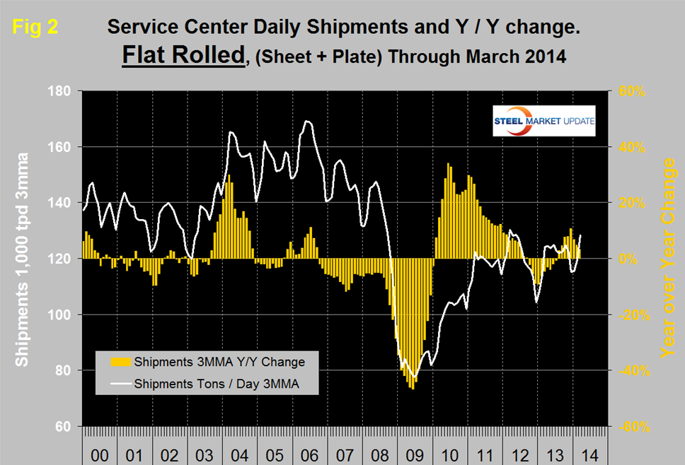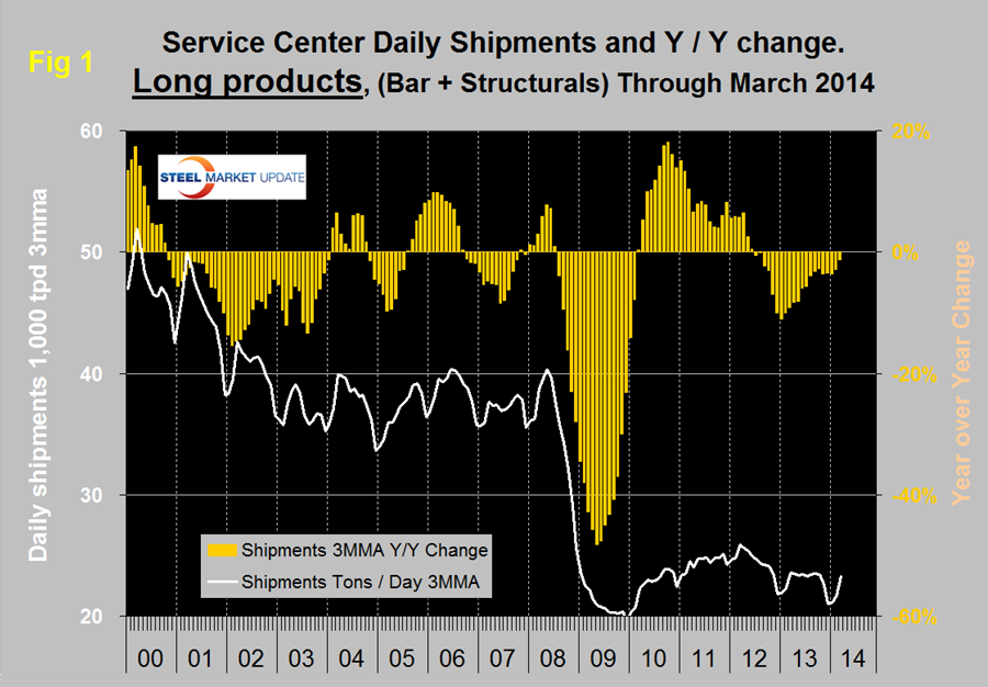 There is a wide difference between the performance of flat rolled, (sheet + plate) and long products, (structurals + bar) at the service center level. Long products had a very poor recovery from the recession and on a y/y basis have been declining once again for every one of the last 21 months, (Figure 1).