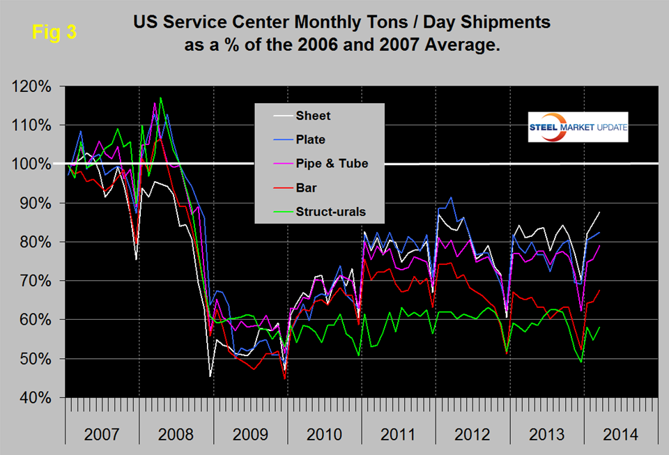 In 2006 and 2007, the good old days, the mills and service centers were operating at maximum capacity. Figure 3 takes the shipments by product since that time frame and indexes them to the average for 2006 and 2007 in order to measure the extent to which each product’s shipments from service centers has recovered. Again it can be seen that sheet and plate have fared best, bar and structurals the worst and tubulars in between. Sheet has had the best recovery and in March was at 87.7 percent of the 2006 /2007 average. This is the best performance since the recession. Structurals are still only at 58.0 percent of where they were. The total of all carbon products is still only at 78.9 percent of the 2006 / 2007 average, therefore, is down by 21.1 percent. The recovery of the service center sector has been much slower than has been experienced by the mills. Presumably this is because in a relatively lack luster market, more buyers are by-passing service centers and buying mill direct and this is probably particularly true of long products. In addition, long products being more construction oriented are suffering from prevailing conditions in that business sector.