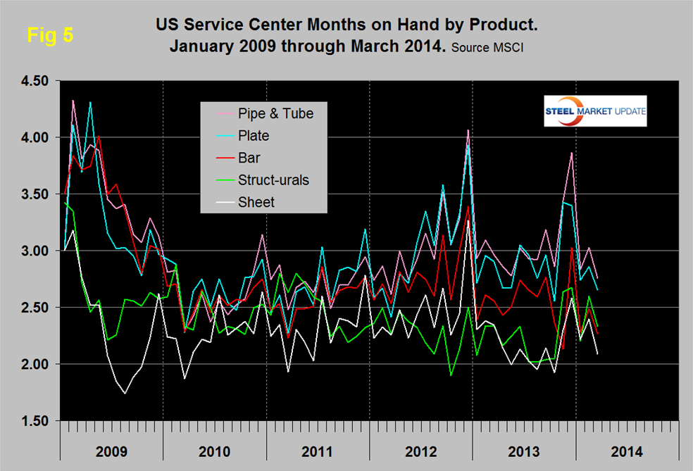 Figure 5 shows the change of inventory at service centers since 2009 measured as months on hand. All products experienced a decline in months on hand at the end of March. Sheet products constitute by far the largest segment of service center’s business and they have had the best inventory management since 2009 and currently have the lowest months on hand.