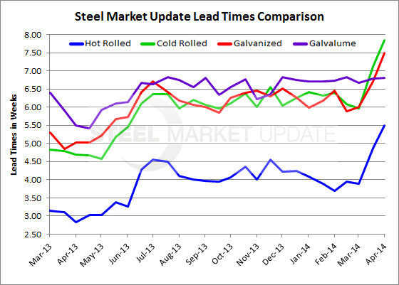 Galvanized lead times also increased by a week and a half moving from 5.88 weeks at the beginning of March to 7.49 weeks this week. Galvanized lead times are 2.5 weeks longer this April than last when we calculated the average lead time in the middle of April to be 5.02 weeks.
